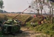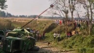 कंबाइन मशीन पलटी, बाल-बाल बचा ड्राइवर, टल गया बड़ा हादसा।