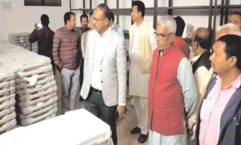 महाराजगंज जिला अधिकारी संतोष कुमार शर्मा ने कलेक्ट्रेट परिसर स्थित बीवी पद स्ट्रांग रूम में वेयरहाउस का निरीक्षण करते हुए एवं और वी वी पैड की सुरक्षा व्यवस्था की विस्तार से समीक्षा की निरीक्षण के दौरान उन्होंने सुरक्षा गार्ड्स की तैनाती सीसीटीवी कंट्रोल रूम, विद्युत सुरक्षा एवं प्रवेश व्यवस्था का अवलोकन किया ।जिलाधिकारी ने निर्देश दिया कि ईवीएम एवं वीवीपैड का रख रखाव भारत निर्वाचन आयोग के नियमानुसार उसे रखा जाए। उन्होंने सभी सीसीटीवी कैमरे को क्रियाशील रखना एवं रिकॉर्डिंग का सुरक्षित भंडारण, विद्युत ऊर्जा इंतजाम ,रोस्टरवर ड्यूटी मानकों अनुसार संचालित करने के निर्देश दिए ।निरीक्षण के दौरान उपस्थित मान्यता प्राप्त राजनीतिक दलों के प्रतिनिधियों ने स्ट्रांग रूम में की गई सुरक्षा व्यवस्था पर संतोष व्यक्त किया।
