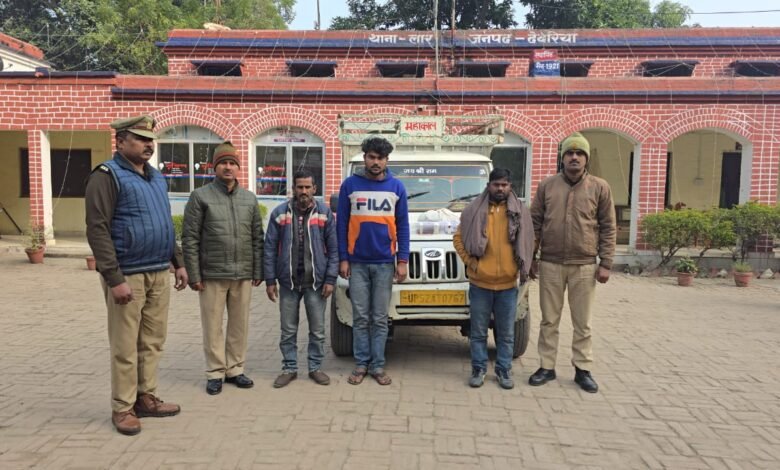 स्वाभिमान जागरण देवरिया। मेहरौना बार्डर पर सख़्ती के बाद कुछ दिनों से खरवनिया पुल व चनुकी पुल के रास्ते पशु तस्करी की खबरें आ रहीं थीं। आज लार पुलिस ने ग्राम रावतपार रघेन के पास से 01 महिन्द्रा पीकप वाहन संख्या UP 52 AT 0767 से उसमें गोवंश को क्रूरतापूर्वक बांधकर कटवाने के लिये बिहार/बंगाल ले जायी जा रही 04 राशि गोवंश के साथ 03 पशु-तस्करों क्रमशः 1. फैयाज नट पुत्र मालधन नट साकिन जमुआ न0 2 थाना सलेमपुर जनपद देवरिया, 2. जशुराम पुत्र चन्द्रमा राम साकिन पचलखी थाना नौतन जिला सीवान व 3. श्याम बहादुर यादव पुत्र पारस यादव साकिन पचलखी थाना नौतन जिला सीवान को गिरफ्तार किया गया । बरामद गोवंश व पिकअप वाहन को कब्जे में लेकर गिरफ्तार अभियुक्तों के विरुद्ध थाना स्थानीय पर मु0अ0सं0 03/2026 धारा 3/5A/8 गोवध निवारण अधिनियम व 11 पशु क्रूरता अधिनियम का अभियोग पंजीकृत करते हुए नियमानुसार अग्रिम विधिक कार्यवाही की जा रही है तथा घटना मे प्रयुक्त 01 पीकप वाहनों को धारा 207 एमवी एक्ट के तहत सीज किया गया है।