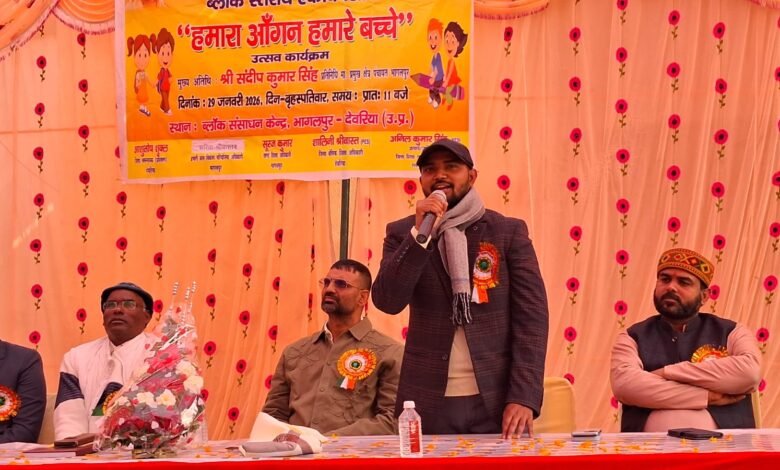 स्वाभिमान जागरण मईल। आज स्थानीय बीआरसी भागलपुर (मईल) में ब्लॉक स्तरीय एक दिवसीय ‘ हमारा आंगन हमारे बच्चे’ उत्सव कार्यक्रम में बतौर मुख्य अतिथि संदीप कुमार सिंह प्रतिनिधि क्षेत्र पंचायत प्रमुख भागलपुर ने अपने संबोधन में निपुण भारत अभियान के अंतर्गत प्रदेश में भागलपुर को प्रथम स्थान पर ले जाने के लिए अपनी ओर से हर संभव सहयोग करने का आश्वासन दिया। उन्होंने कहा कि विद्यालयी शिक्षा के साथ साथ कौशल विकास भी उनके बहुमुखी विकास के लिए आवश्यक है। विद्यालय केवल पढ़ने लिखने के केंद्र नहीं बल्कि भावी जीवन की नींव हैं। कार्यक्रम का शुभारंभ मां सरस्वती की चित्र पर संदीप कुमार सिंह , सूरज कुमार द्वारा दीप प्रज्वलन कर किया गया।