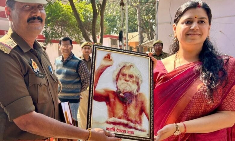 जिलाधिकारी को मईल थानाध्यक्ष ने देवरहा बाबा का चित्र किया भेंट