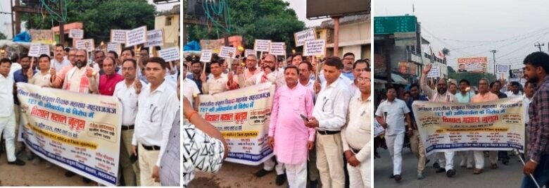 महराजगंज में टेट अनिवार्यता के विरोध में शिक्षकों ने निकला विशाल मशाल जुलूस।
