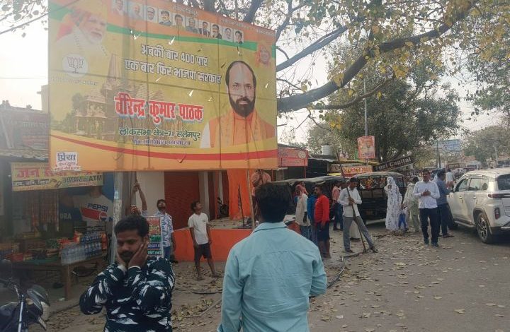 लार नगर पंचायत में कर्मचारी बिजली के खंभों और अन्य जगहों पर लगे होर्डिंग बैनर को उखाड़ते देखे गए।