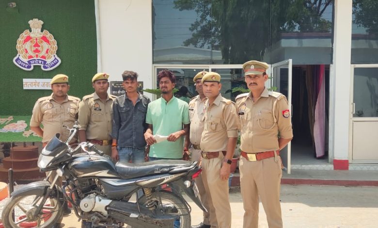 देवरिया। सलेमपुर पुलिस ने चोरी की गई बाइक तथा अवैध तमंचा के साथ दो लोगो को गिरफ्तार किया। इनकी पहचान जिले के मइल थाना के कसिली गांव के राम सरीखा पुत्र शारदा व सूरज गुप्ता पुत्र दीना नाथ के रूप में हुई है। पुलिस को सूचना मिली थी कि दो लोग चोरी की गई मोटरसाइकिल लेकर बिहार से आ रहे जो सोहनाग होते हुए मईल के तरफ जायेंगे। इस पर तत्काल पुलिस ने घेरा बंदी कर दोनो युवकों को पकड़ लिया । पुलिस के अनुसार दोनो युवक राम सरीखा पुत्र शारदा व सूरज गुप्ता पुत्र दीना नाथ निवासी गण कसिली , थाना मईल, जिला देवरिया को गिरफ्तार करके जेल भेज दिया गया।