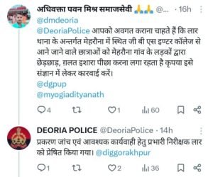 देवरिया। यूपी -बिहार बार्डर पर स्थित लार थाना के मेहरौना में स्कूल की बच्चियों के पीछे कुछ मनचले पड़े हैं। लोकलाज और बदनामी के डर से स्कूली छात्राएं जुबां नहीं खोल रहीं। कुछ छात्राओं ने अपने घर इस बात की जानकारी दी। छात्राएं या उनके स्वजन पुलिस को कोई लिखित या मौखिक सूचना तो नहीं दिए लेकिन समाज के प्रबुद्धवर्ग के कानो तक बात पहुंचा दिए। इस गंभीर मसले पर अधिवक्ता पवन कुमार मिश्र ने उत्तर प्रदेश के मुख्यमंत्री योगी आदित्यनाथ सहित , देवरिया की जिलाधिकारी, सूबे के पुलिस प्रमुख डीजीपी को ट्वीट के माध्यम से यह शिकायत दर्ज करा दी। शिकायत में आरोप लगाया गया है कि स्कूल से छात्राओं के निकल कर घर जाते समय मेहरौना के कुछ मनचले पीछे लग जाते हैं। गलत इशारे करते हैं। छेड़छाड़ करते हैं। अधिवक्ता की शिकायत पर देवरिया पुलिस की तरफ से जवाब दिया गया है कि मामला प्रभारी निरीक्षक को जांच एवं आवश्यक कार्रवाई के लिए भेजा गया है।