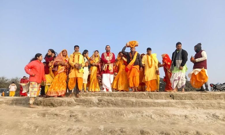 मईल ( देवरिया )।क्षेत्र के पिपरा मिश्र गांव में होने वाले श्रीमद्भागवत कथा ज्ञान यज्ञ के लिए बड़े ही धूमधाम से कलश यात्रा निकली ।कलश यात्रा में सैकड़ो महिला पुरुष श्रद्धालु पीताम्बर ओढ़े यज्ञ स्थल पिपरा मिश्र गांव से होते हुए राजीव नगर,मईल ,नरियांव ,देवसिया के रास्ते भागलपुर के सरयू नदी के पावन तट पर पहुँचे ।सरयू तट पर आचार्य बृजेश मणि त्रिपाठी व अन्य आचार्यो द्वारा वैदिक मंत्रोच्चार के बीच कलश में जल भरा गया ।कलश में जल भरकर श्रद्धालु इशारु ,मुरारबारी,लक्ष्मण चौराहा,कुंडौली ,मईल होते हुए यज्ञ स्थल पहुँच कर कलश स्थापित किया ।इस दौरान मुख्य यजमान कौशल्या देवी , सुधाकर मिश्र,मनीष मिश्रा, रौनक मिश्रा,राजकुमार त्रिपाठी , पवन त्रिपाठी,कन्हैया लाल तिवारी, सहित सैकड़ों महिला पुरुष श्रद्धालु मौजूद रहे ।
