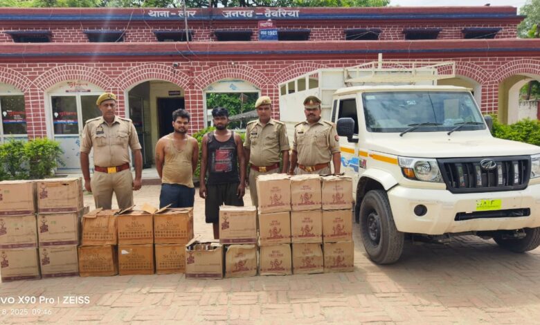 पुलिस अधीक्षक देवरिया श्री विक्रान्त वीर द्वारा जनपद में अवैध शराब के विरुद्ध चलाये जा रहे अभियान *“ऑपरेशन प्रहार”* के तहत अपर पुलिस अधीक्षक दक्षिणी श्री सुनील कुमार सिंह के निर्देशन में तथा क्षेत्राधिकारी सलेमपुर श्री दीपक शुक्ल के कुशल पर्यवेक्षण में थाना लार पुलिस द्वारा आज दिनांक 08.07.2025 को संदिग्ध व्यक्तियों व वाहनों की चेकिंग के दौरान मुखबिर की सूचना पर मेहरौना चेक पोस्ट से बिना नम्बर प्लेट की एक पिकप वाहन से आलू और लौकी की बोरियों के बीच छिपाकर बिहार ले जायी जा रही विभिन्न धारिताओं की पंजाब निर्मित अंग्रेजी शराब क्रमशः 1. 11 पेटी रायल स्टैग, 2. 15 पेटी रायल चैलेंज व 3. 06 पेटी आल सीजन (कुल 32 पेटी) के साथ 02 अभियुक्तों क्रमशः1. अँकेश पुत्र रामजी शाह निवासी सूरवीर थाना सिवान जिला सिवान (बिहार) व 2.शशि कुमार पुत्र उपेन्द्र सिंह निवासी करपी थाना करपी जिला अलवर (बिहार) को गिरफ्तार करते हुए उनके विरुद्ध थाना स्थानीय पर मु0अ0सं0-242/2025 धारा-318(4), 319(2) बीएनएस0 व 60/63 आबकारी अधिनियम का अभियोग पंजीकृत करते हुए नियमानुसार अग्रिम विधिक कार्यवाही की जा रही है ।