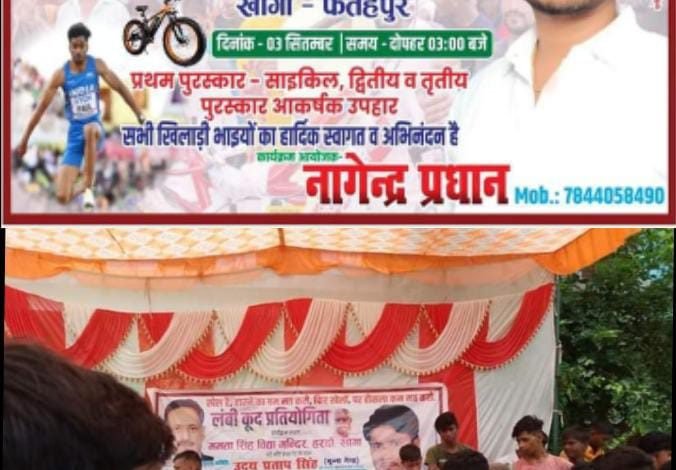फतेहपुर/ खागा नगर पंचायत अंतर्गत ग्राम सभा हरदो ग्राम प्रधान नागेंद्र यादव के नेतृत्व में पिछले वर्ष की भांति इस बार भी लंबी कूद प्रतियोगिता का आयोजन किया गया है। विभिन्न क्षेत्रों के युवा बच्चों को प्रतियोगिता में अपनी अपनी योग्यता का प्रदर्शन करने के लिए आमंत्रित किया गया है। लंबी कूद प्रतियोगिता में कई जनपदों के प्रतियोगिता के प्रति रुचि रखने वाले खिलाड़ियों को भी आमंत्रित किया गया है प्रतियोगिता का आयोजन 3 सितंबर को खागा किशनपुर रोड स्थित लंबरदार मार्केट के करीब होना सुनिश्चित किया गया है । प्रतियोगिता के अंतर्गत कुशल योग प्रथम विजेता को साइकिल के साथ-साथ द्वितीय तृतीया उपविजेताओं को आकर्षक पुरस्कार दिए जाएंगे! वहीं क्षेत्र के लोगों में खासकर बुजुर्ग लोगों में प्रतियोगिता होने पर खुशी की लहर दौड़ रही है! वही आयोजक हरदो प्रधान नागेंद्र यादव ने बताया कि प्रतियोगिता का मुख्य उद्देश्य बच्चों के अंदर छुपे हुनर को उभारना है।