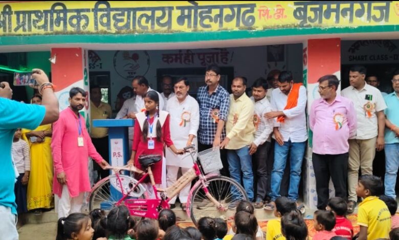 बृजमनगंज क्षेत्र के अंतर्गत पीएम श्री प्राथमिक विद्यालय मोहनगढ़ क्षेत्र बृजमनगंज जनपद महाराजगंज के प्रांगण में राष्ट्रपिता महात्मा गांधी एवं पूर्व प्रधानमंत्री लाल बहादुर शास्त्री जी के जयंती के शुभ अवसर पर मोहनगढ़ की दो छात्राओ खुशबू ,सुषमा एवं धरनामपुर की एक छात्रा साधना यादव को अंत्योदय फाउंडेशन मुंबई द्वारा प्राप्त तीन साइकिलों को पूर्व विधायक बजरंग बहादुर सिंह एवं आदर्श नगर पंचायत बृजमनगंज के लोकप्रिय चेयरमैन राकेश जयसवाल ब्लॉक प्रमुख उदय राज यादव पूर्व जिला पंचायत योगेंद्र यादव की गरिमा में उपस्थिति में वितरित किया गया l