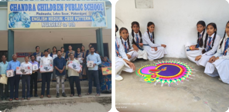शुभ दीपावली पर्व के धनतेरस के दिन चंद्रा चिल्ड्रेन पब्लिक स्कूल फुलमनहा मे प्रबंधक सुधेश मोहन श्रीवास्तव के तरफ से स्कूल के वरिष्ठ सदस्य अमित मोहन श्रीवास्तव के द्वारा विद्यालय के सभी शिक्षक/शिक्षिकाओं व अन्य कर्मचारियों को उपहार देकर सम्मानित कर शुभकामनायें दी गयी। इसी कड़ी में आज विगत वर्षों की भांति इसवर्ष भी आज जूनियर कक्षा के छात्राओं द्वारा रंगोली का कार्यक्रम एवं प्राथमिक कक्षा के छात्र /छात्राओं द्वारा दीपावली पर्व मनाया गया ।