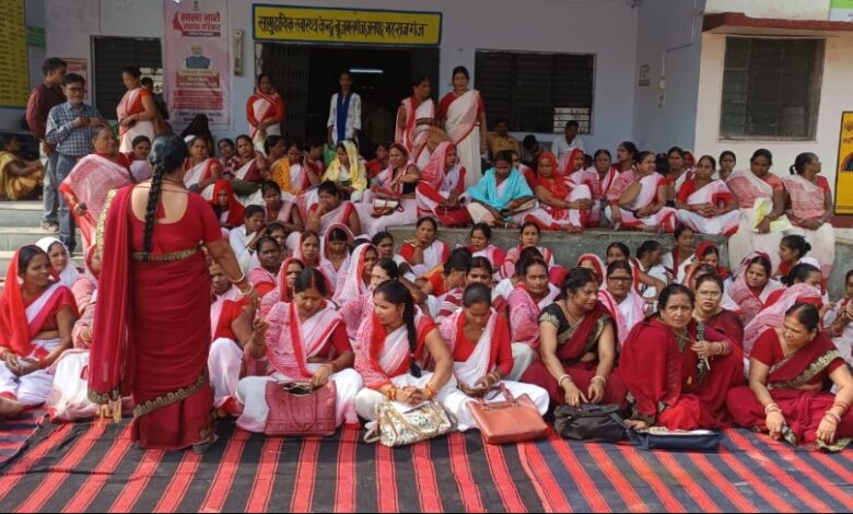 महाराजगंज में आशा बहुओं ने सभी सामुदायिक स्वास्थ्य केंद्रों पर दिया धरना।