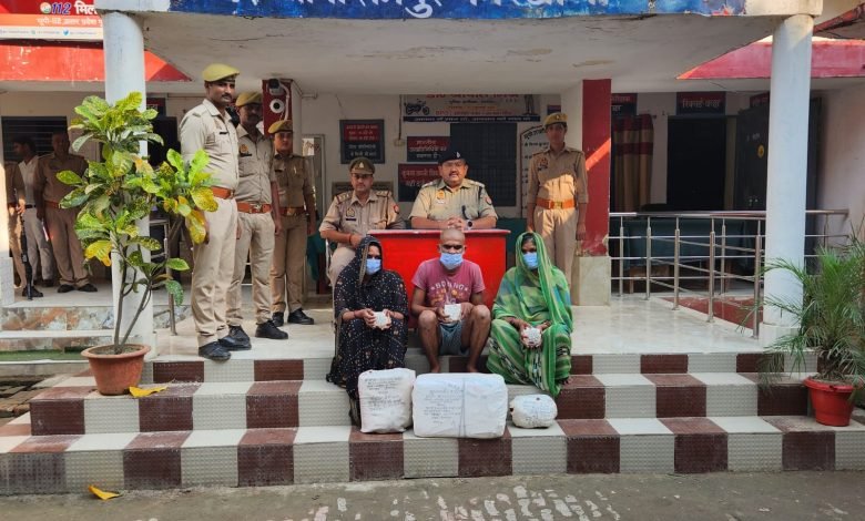 देवरिया। रामपुर कारखाना की पुलिस टीम द्वारा मुखबीर की सूचना के आधार पर गौरा चौराहा थाना रामपुर कारखाना पर स्थित एक श्रृंगार की दुकान पर छापेमारी कर तीन अभियुक्तगणों को 26.15 किलो अवैध गांजा के साथ गिरफ्तार किया गया। गिरफ्तारी के समय उपस्थित क्षेत्राधिकारी नगर श्रीयश त्रिपाठी के समक्ष जामा तलाशी के दौरान अभियुक्त सनी दयाल उर्फ सन्नी पुत्र स्व0 बुद्धिचन्द चौहान निवासी बैकुण्ठपुर थाना रामपुर कारखाना जनपद देवरिया के पास से एक प्लास्टिक के बोरे मे 20.1 किलो, अभियुक्ता संगीता देवी पत्नी सनी दयाल उर्फ सन्नी निवासी बैकुण्ठपुर थाना रामपुर कारखाना जनपद देवरिया के पास से एक मोटे कपड़े के थैले से 4 कि0ग्रा0 व अभियुक्ता मुनिया देवी पत्नी स्व0 बुद्धिचन्द चौहान निवासी बैकुण्ठपुर थाना रामपुर कारखाना जनपद देवरिया के पास से एक प्लास्टिक के थैले से 1.9 कि० ग्रा० अवैध गांजा बरामद हुआ।